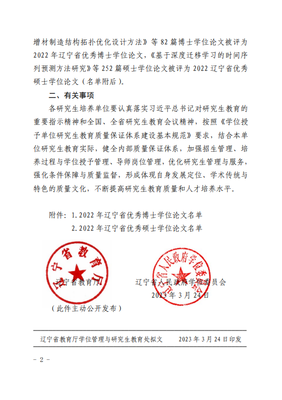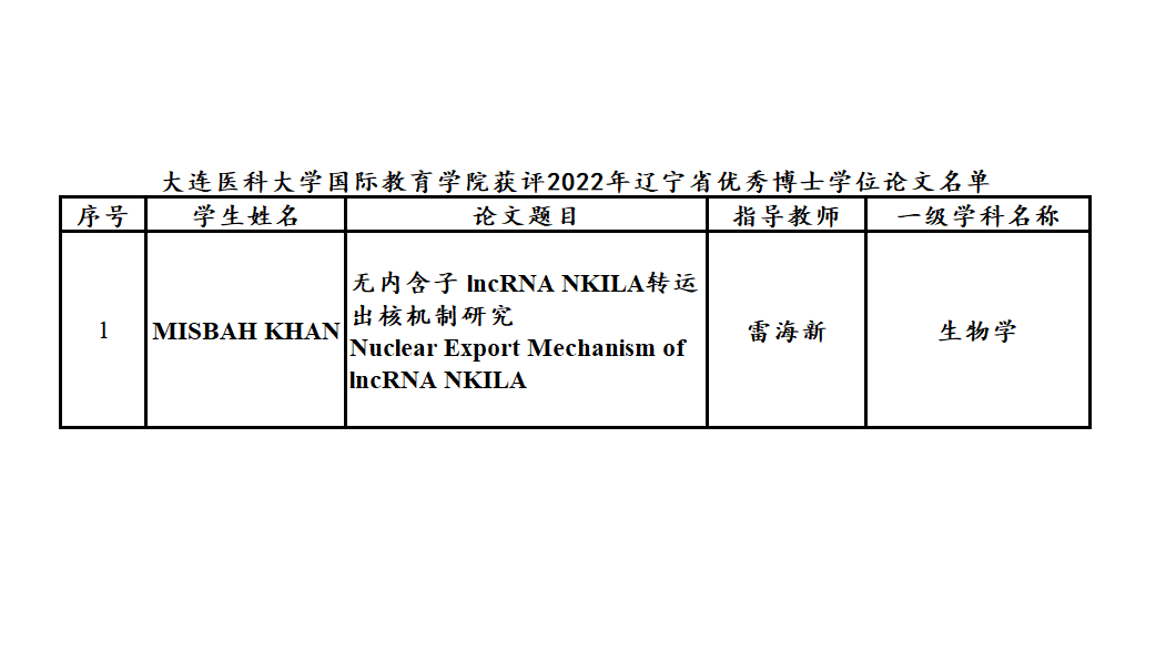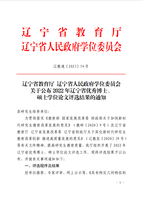 近日,辽宁省教育厅办公室公布了2022年辽宁省优秀博士、硕士学位论文的评选结果。由雷海新教授指导的留学生MISBAH KHAN撰写的学位论文获评优秀博士学位论文,为本次唯一一位获评辽宁省优秀学位论文的外国留学生,这也是我校博士留学生首次获评辽宁省优秀博士论文。