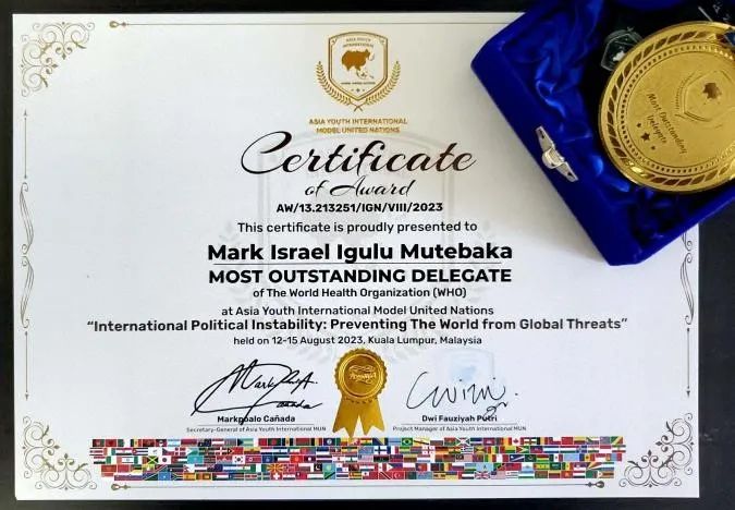 2023年8月12-15日,第12届亚洲青年国际模拟联合国(AYIMUN)活动在马来西亚吉隆坡举行,我校英语授课临床医学专业本科生,来自乌干达的马克(Mark Israel Igulu Mutebaka)同学首次参加AYIMUN活动并获得“世界卫生组织最杰出代表”。