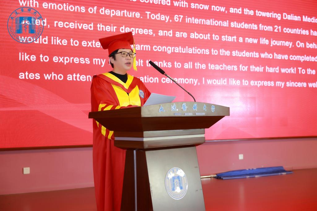 临床医学本科专业留学生马克代表毕业生发言,他对母校的培养表示感谢并表示今后会以大医校友身份继续发光发热,传承大医精神。随后,毕业生代表向辛勤培育、悉心指导他们的教师代表献花。在毕业典礼和导师大会间歇,毕业生还表演了精心准备的节目,表达了对母校的感谢和敬意。