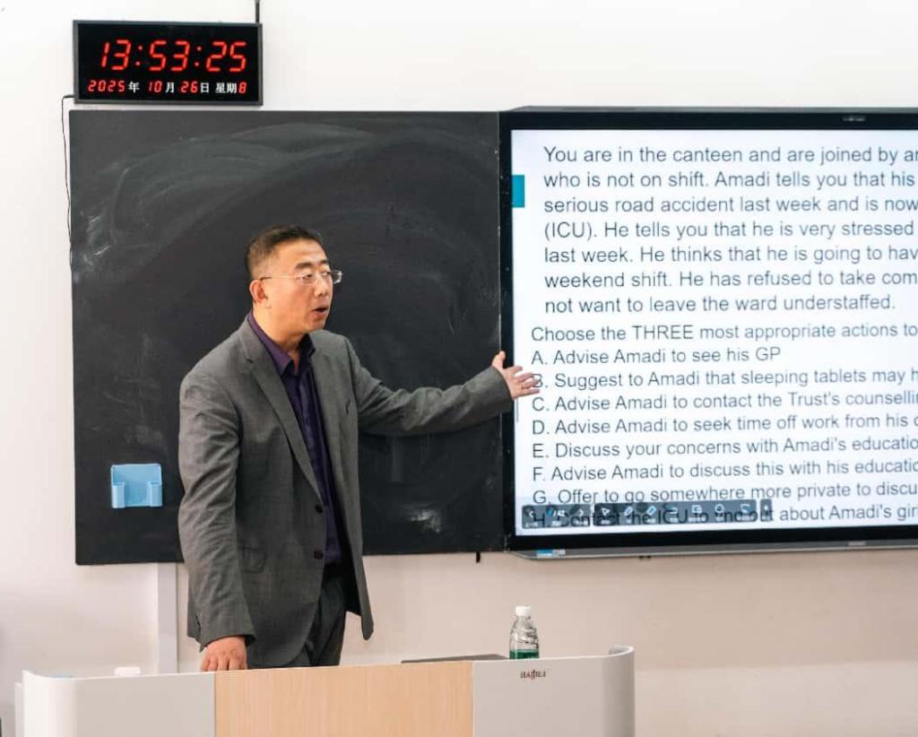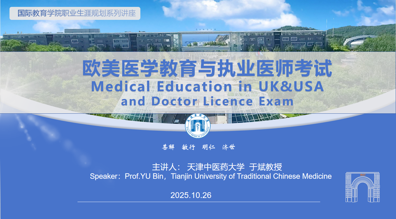 在学院楼G111教室成功举办了首期留学生职业生涯规划专题讲座。此次讲座特邀天津中医药大学于斌教授,以“欧美医学教育体系及执业医师考试”为主题,为来自20多个国家的200余名留学生带来了一场内容丰富、实用性强的专业指导。