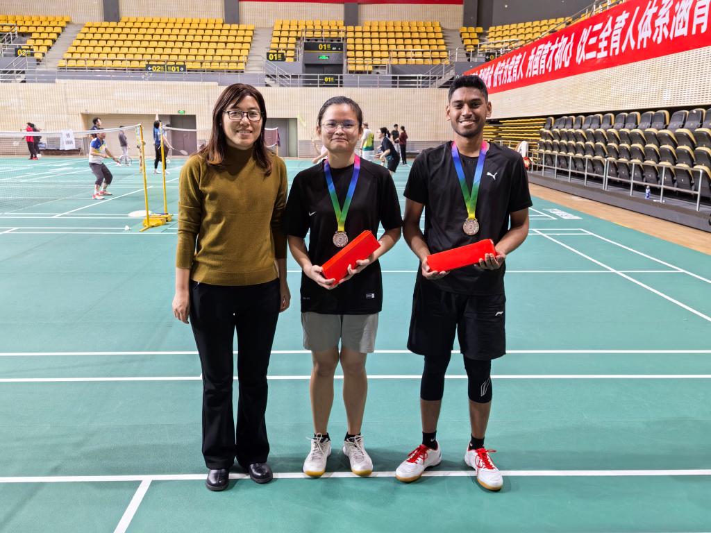 中午,比赛正式打响。男单首局便迎来高潮:伊朗籍学生阿米巴思与斯里兰卡籍学生迪岚多拍对拉,网前劈吊与后场跳杀交替上演,比分一路胶着;女单赛场同样精彩,印度尼西亚籍学生陈佳纹以灵活的步伐和精准的落点控制连连领先。经过三轮单淘汰赛,阿米巴思摘得男单冠军,女单冠军则被斯里兰卡籍学生罗威妮收入囊中。
